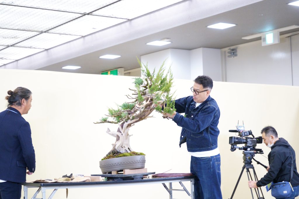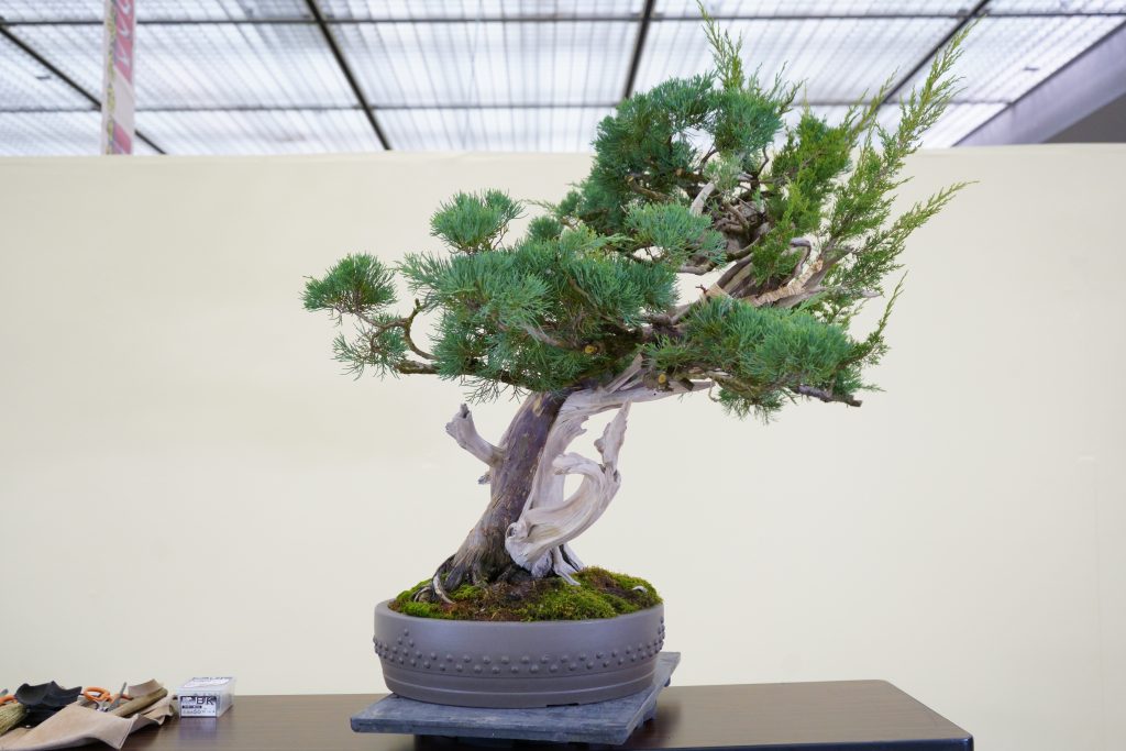盆栽界の最高峰の一つ「日本盆栽大観展」。その第45回開催時、多くの愛好家を釘付けにしたのが、東北・岩手の名匠、大町功(おおまち いさお)氏による真柏(シンパク)のデモンストレーションです。
