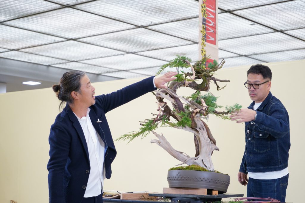 盆栽の改作において、最も重要であり、最も難しいのが「正面(しょうめん)」の決定です。大町氏のアシスタントを務めた井浦氏が、観客に意見を求めながら樹を360度回転させるシーンは、盆栽制作の醍醐味を感じさせます。